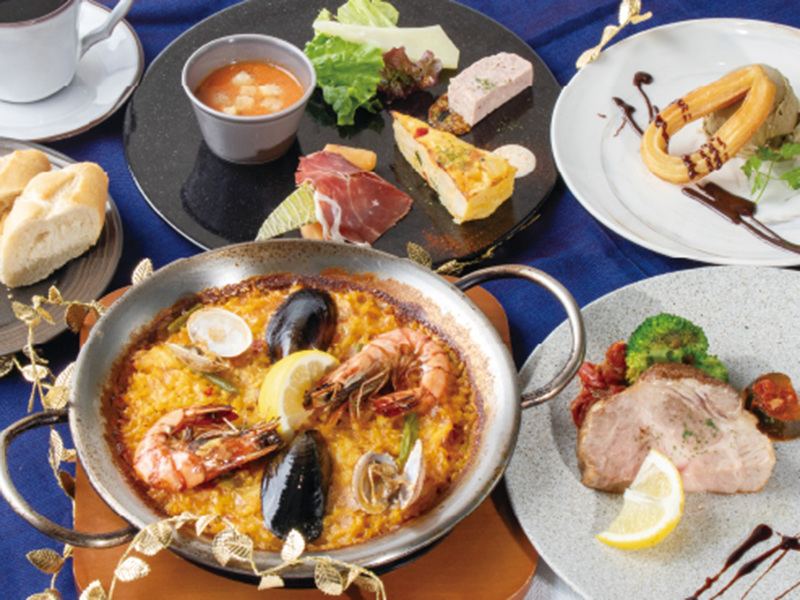 生産者との独自ルートによる厳選食材を使ったスペイン料理をぜひ! 「休日スパニッシュコース」は前菜盛合せ、スペイン産白豚のローストポーク、スペインのパン、6種から選べるパエリア、チュロスと季節のアイス、選べるソフトドリンクが付いた、ちょっと贅沢なコース。土日祝と12/22~31限定で提供。頑張った自分に冬のご褒美を♪