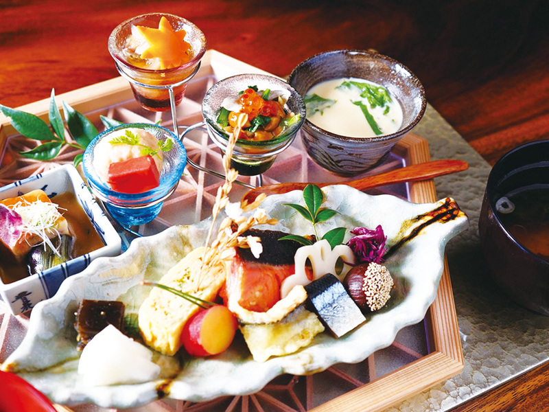 月〜金曜・数量限定の「日替わり和食御膳」は目にも美しい品々が並ぶ。主菜、茶碗蒸し、煮物、小鉢三種、御飯、香の物。毎朝取った鰹出汁で作る味噌汁はおかわり無料。