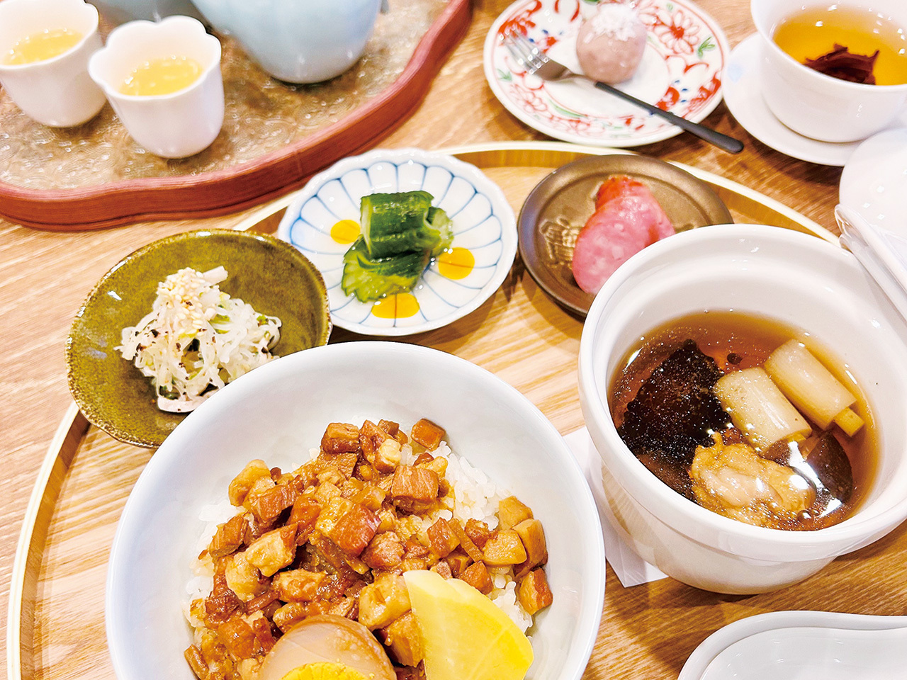 台湾出身の店主が本場の味を提供する。写真は、スープ、小菜3品、一口甘味、台湾茶付の「魯肉飯セット(1,750円)」。甘味の豆花や、もちもちのタピオカミルクティーにも注目。台湾茶器を使った本格台湾茶とともに過ごすティータイムもおすすめ♪