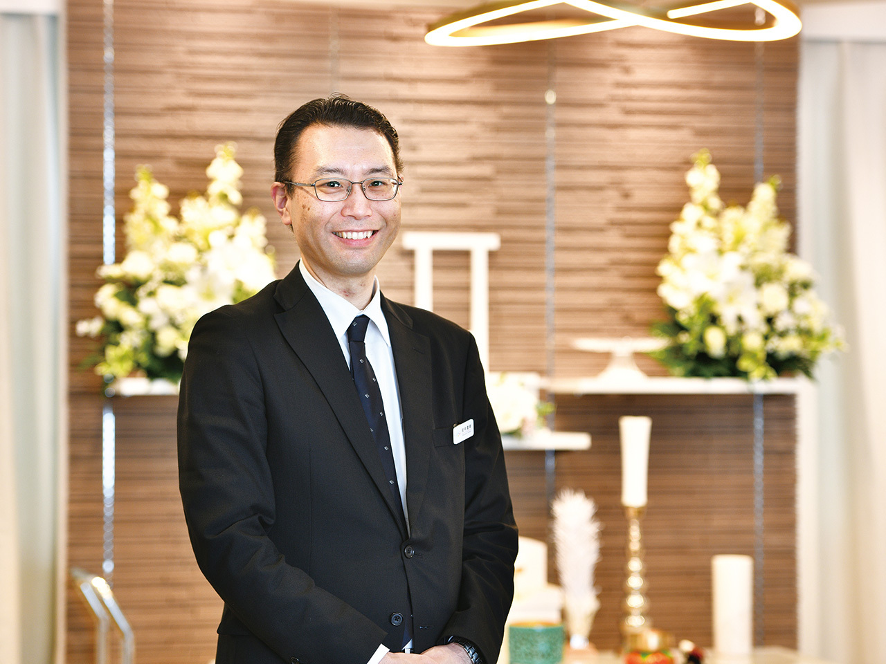 遺族の最初の窓口がプランナー、その計画を形にするのがディレクター。田中さんは当日の司会や誘導、葬儀の相談まで幅広くこなしている。45歳の彼がこの道を志したのは9年前、くも膜下出血で倒れたことがきっかけ。回復後の転職活動中に今の社長と出会い、死に直面して不安な時に寄り添ってくれる存在の大切さを実感し、葬祭の世界へ。「花安」は、新発田で花屋から始まった創業400年の老舗が運営。大手には真似できない柔軟さで、多様化する現代の葬儀ニーズに柔軟に応える。