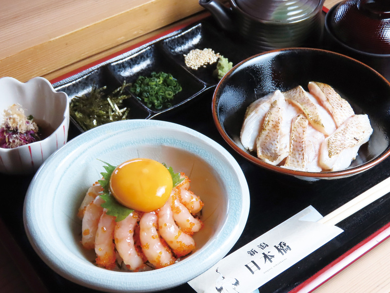 伝統が息づく割烹「新潟日本橋」。新潟県産の最高クラスののどぐろと、甘みが際立つ南蛮海老が一度に味わえる「2色丼セット(4,400円)」は、一日10食限定の逸品。のどぐろは出汁をかけてひつまぶし風に愉しめるのも魅力。洗練された空間で、新潟の海の恵み満載のブランド食材を味わう至福のひとときを。ランチ限定、要予約。