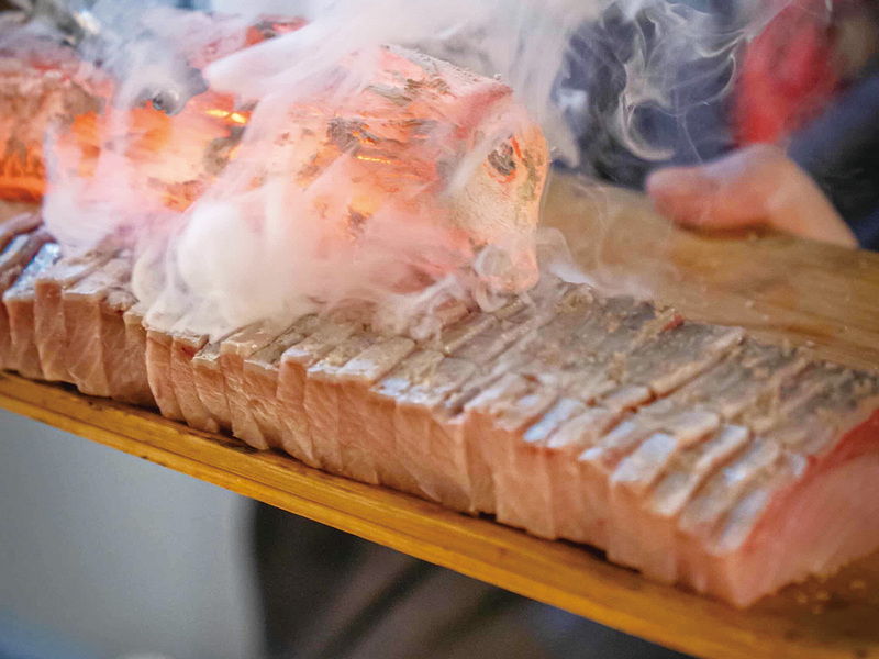 写真は、目の前で真っ赤な備長炭を直接魚に押し当てる「炭焼き霜造り」。香ばしい炭の香りが熟成魚に移り、脂の甘みが際立つ極上の刺身。ゆらりと陽炎漂う囲炉裏の「原始焼き」と共に、五感を震わせる品々が続く。