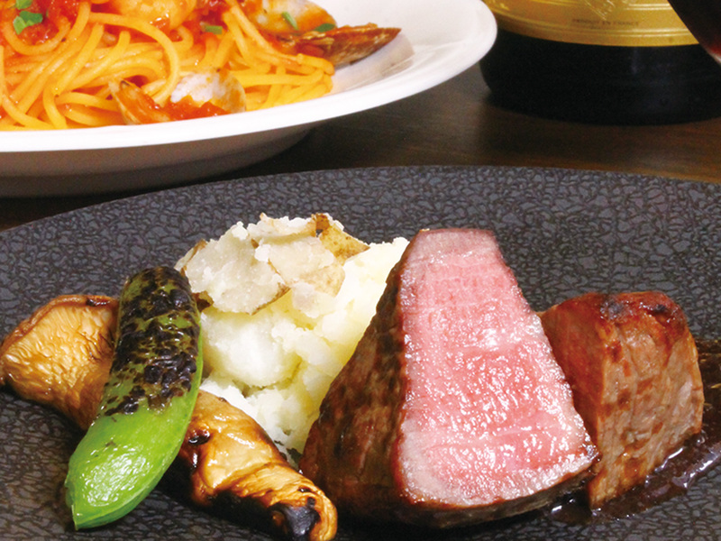 炭火焼きの肉料理と生パスタを中心に、前菜や一品料理まで楽しめる。普段使いからデート、家族での食事まで利用できる。メッセージと花火付きのプレートも用意できるので、記念日やお祝いにも◎。