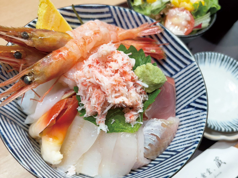 佐渡沖であがった新鮮な天然モノを贅沢に使用した「近海丼」。カニ、アジ、ホッキ貝、南蛮エビ、イカ、アラ、ノドグロなど、その日の仕入れにより内容が変わる。