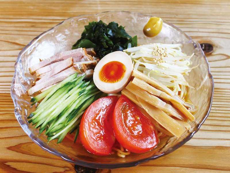「冷やし中華」は、こだわりの魚介スープと特製醤油ダレ仕上げ。ほかに「油そば」「背脂ゆず中華」などオリジナリティあふれるメニューが揃う。