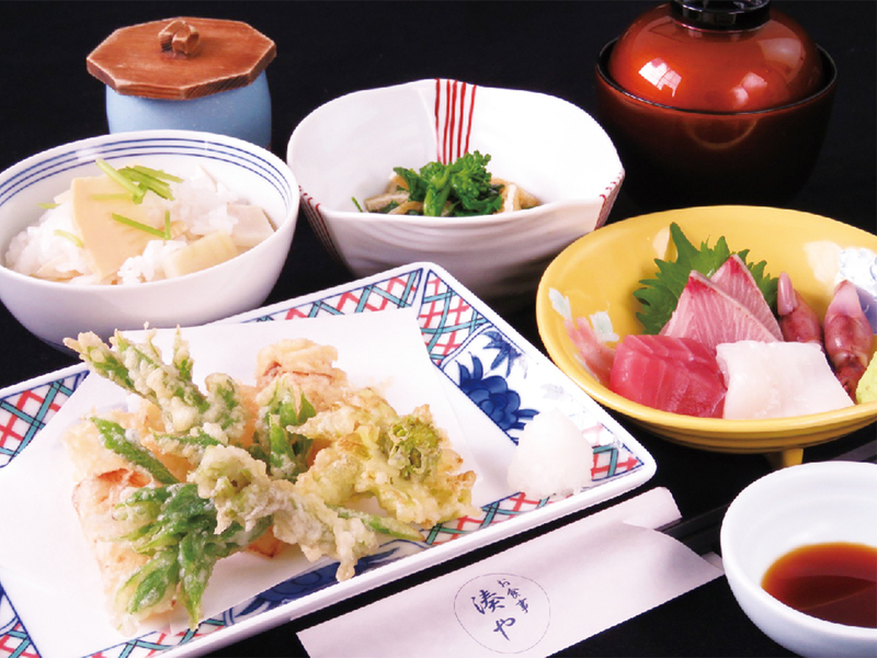 筍ごはんや山菜などの天ぷら盛合せ、旬のお刺身、茶碗蒸し、小鉢が付く。春の芽吹きを食で感じられる一膳。お祝いごとの御膳としてもピッタリ。昼・夜注文可能、数に限りがあるので予約がおすすめ。