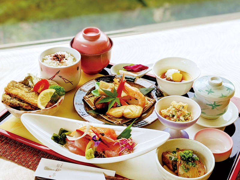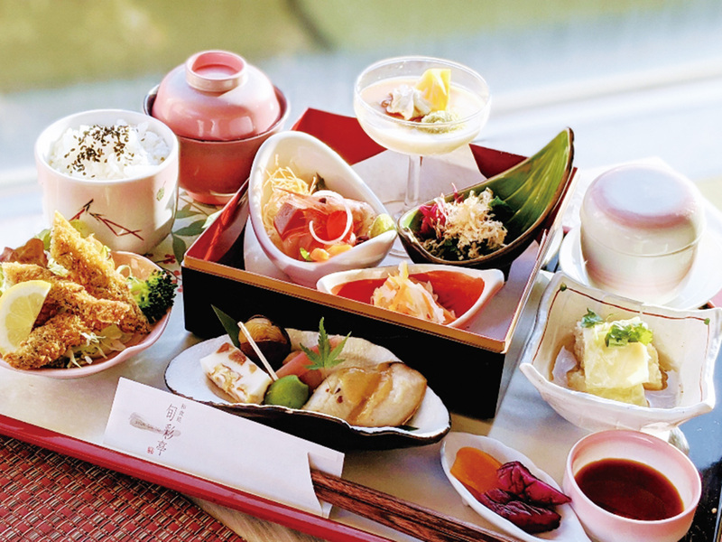 季節の食材を丁寧に調理した和食を味わえると人気の「旬彩亭」。広く落ち着いた雰囲気の店内で、本格和食をゆったり味わえる。7月の「文月ランチ」は刺身三点盛、いわし磯辺フライ、茄子田楽焼き、うなぎ茶わん蒸しなどが並ぶ。座敷、テーブル席、座敷の個室完備で少人数での集まりや慶事・法事、宴会など幅広いシーンで利用できる。