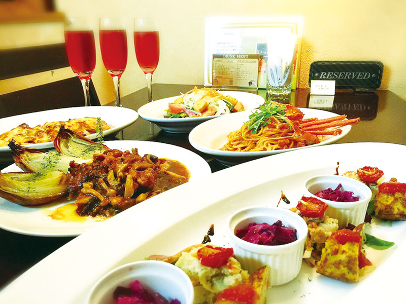 ランチの週替わりメニューは1,200円~。ディナーは前菜・パスタ・メインなど全5品の「パーティープラン(写真左/2,750円・ドリンク別)」も用意。ワインも豊富で、カジュアルに楽しいひと時を楽しめる。