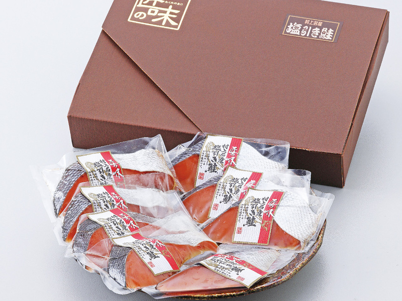写真の「村上名産塩引鮭 8切セット(5,900円・送料込)」も贈答用に人気。平安時代から続く伝統の技で仕上げられた塩引鮭は、保存料・添加物を使わず手作業で丁寧に仕込んだ新潟の逸品。店頭では1切から購入でき、発送も可。