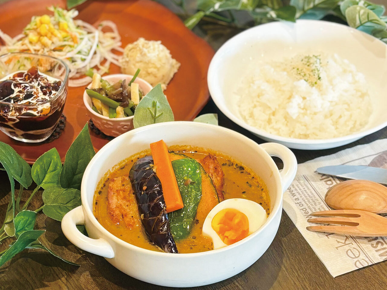 【スープカレーランチ(前菜プレート付き) 1,700円】(写真1) 色とりどりの揚げ野菜がたっぷりと入ったココナッツ香る本格スープカレー。鶏肉と野菜の旨味が溶け出したスパイシーなスープが癖になる♪ ライスorナン選択可。
