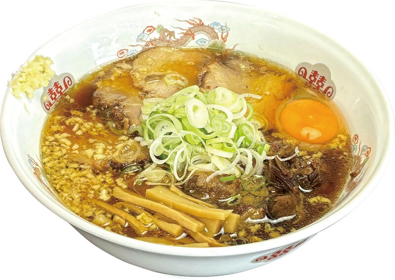 10数年ぶりの新メニューが登場! じっくりと煮込んだ鶏ガラの透き通ったスープは、あっさりとしながらも奥深いコクが広がる。そこに、居酒屋「◯福」とのコラボ商品の絶品もつ煮を贅沢に乗せる! もつ好きが唸るクセになる一杯。数量限定。