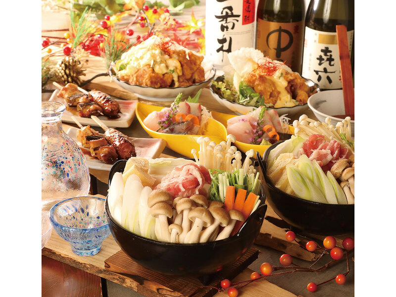 刺身、串焼、鍋を含む全8品。飲み放題+2,500円で生ビール付に。
