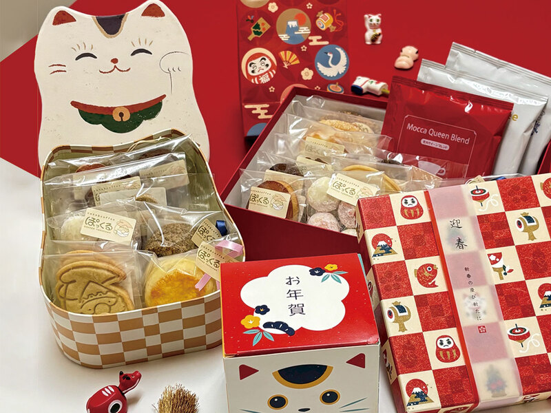 新年の挨拶や手土産にぴったりの、見て笑顔に、食べて幸せになるギフト。写真の招き猫BOX(2,980円)にはクッキーやスコーン、フィナンシェ等の人気焼き菓子が入り、子どもから大人まで喜ばれること間違いなし!