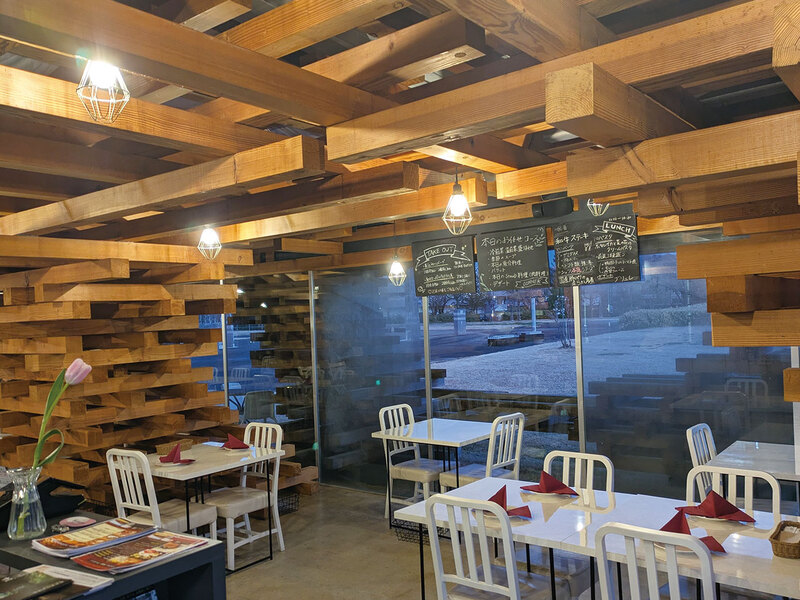 建築家・隈研吾氏が設計した、木の温かみのある店内からは、呉羽駅前の道沿いに咲く桜並木を眺められる。公園内に立地しているため、ゆったりとした時間が流れて居心地よく、ランチやカフェタイムに上質なくつろぎを添えてくれる。