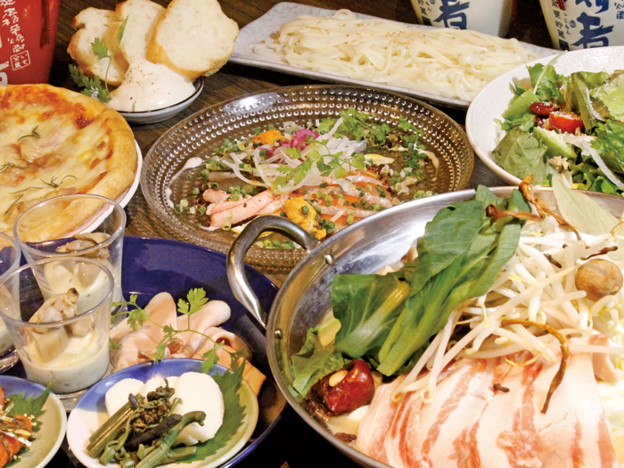 前菜3種、ピザ、鍋(もつ鍋or薬膳鍋)、〆のうどん等全7品。