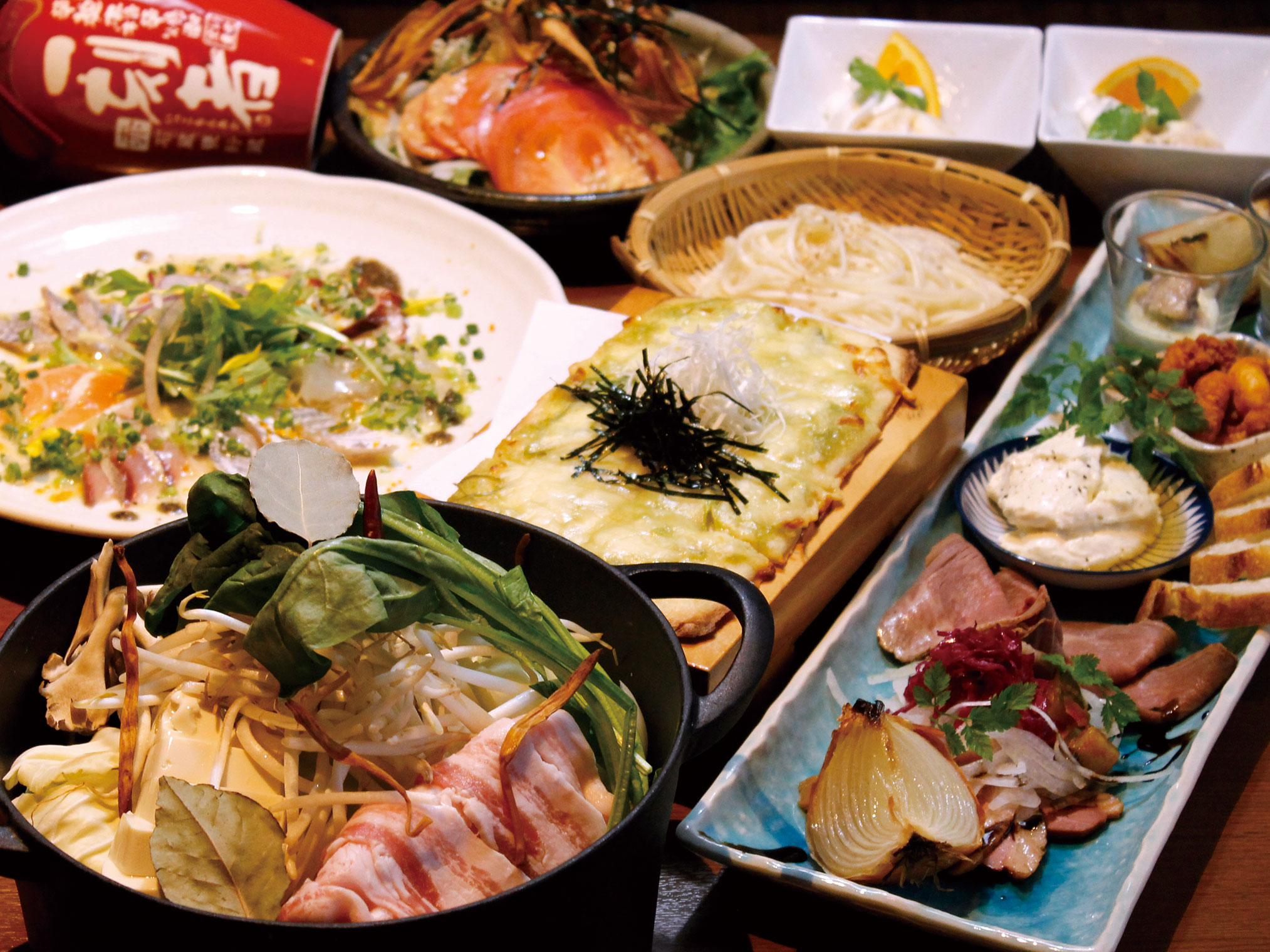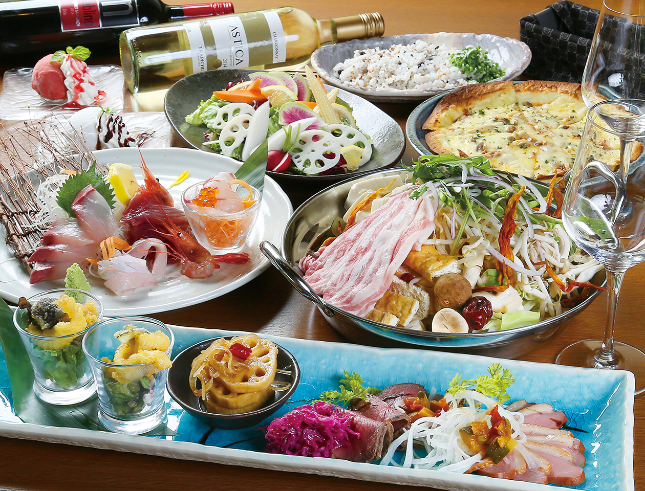 前菜5種盛合わせ、サラダ、4種の鮮魚カルパッチョ、焦がし醤油ピザ、鍋、〆物、一口ケーキの盛合わせ。仕入れ状況により、メニュー変更の場合あり。