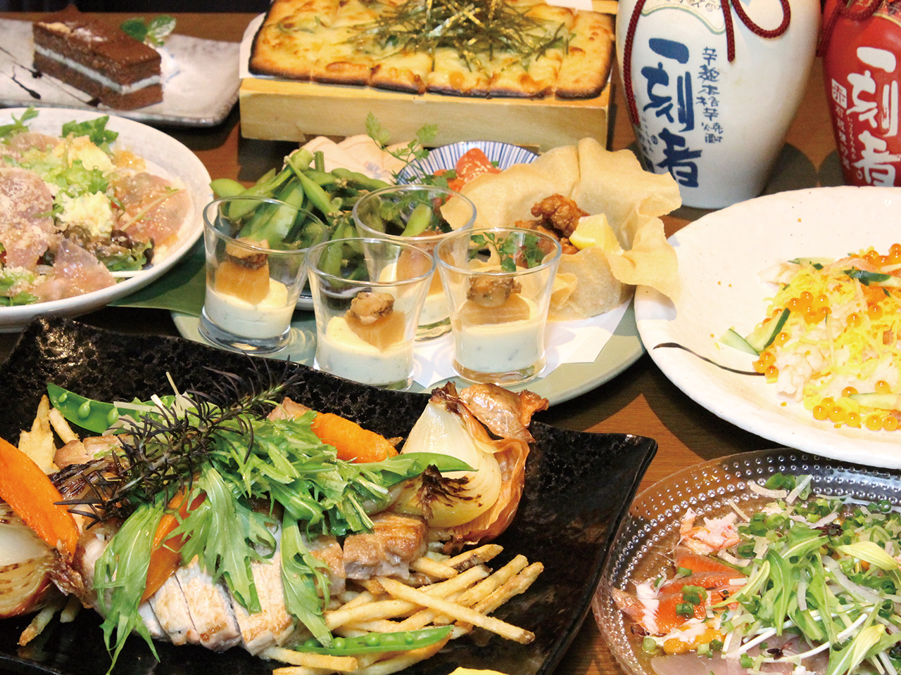 和食をベースにした創作料理は見た目も味も新感覚。コースは、肉、魚、野菜などバランスが良く女性も満足! 飲み放題は約50種と豊富。最大100名までOK!