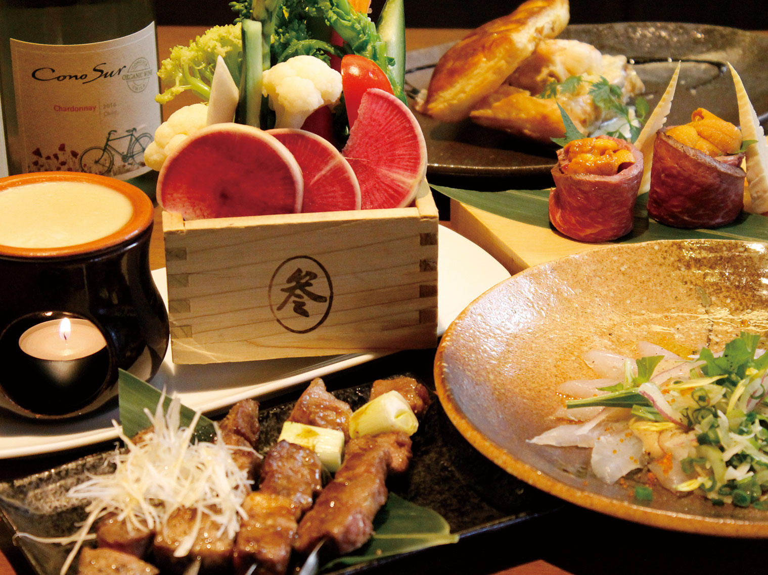 和食をベースにした創作料理は、見た目も味も新感覚! 厳選されたワインやクラフトビールと一緒に、落ち着いた和モダンな空間で楽しんで。最大100名迄OK!!