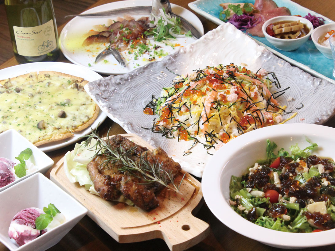 前菜5種盛合わせ、サラダ、4種の鮮魚カルパッチョ、焦がし醤油ピザ、立山ポークと鶏モモ肉のグリル、ちらし寿司、一口ケーキの盛合わせ。仕入れ状況により、メニュー変更あり。