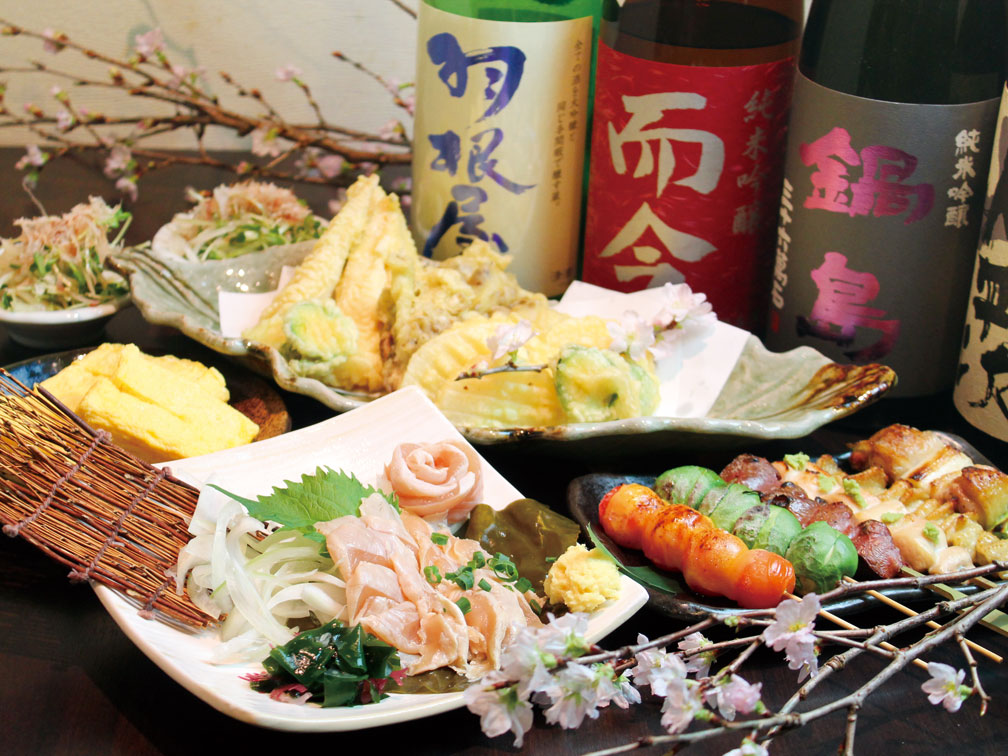 旬菜サラダ、季節の逸品、手羽唐揚げ、炭火焼き鳥、鍋など。他にも各種コースあり。