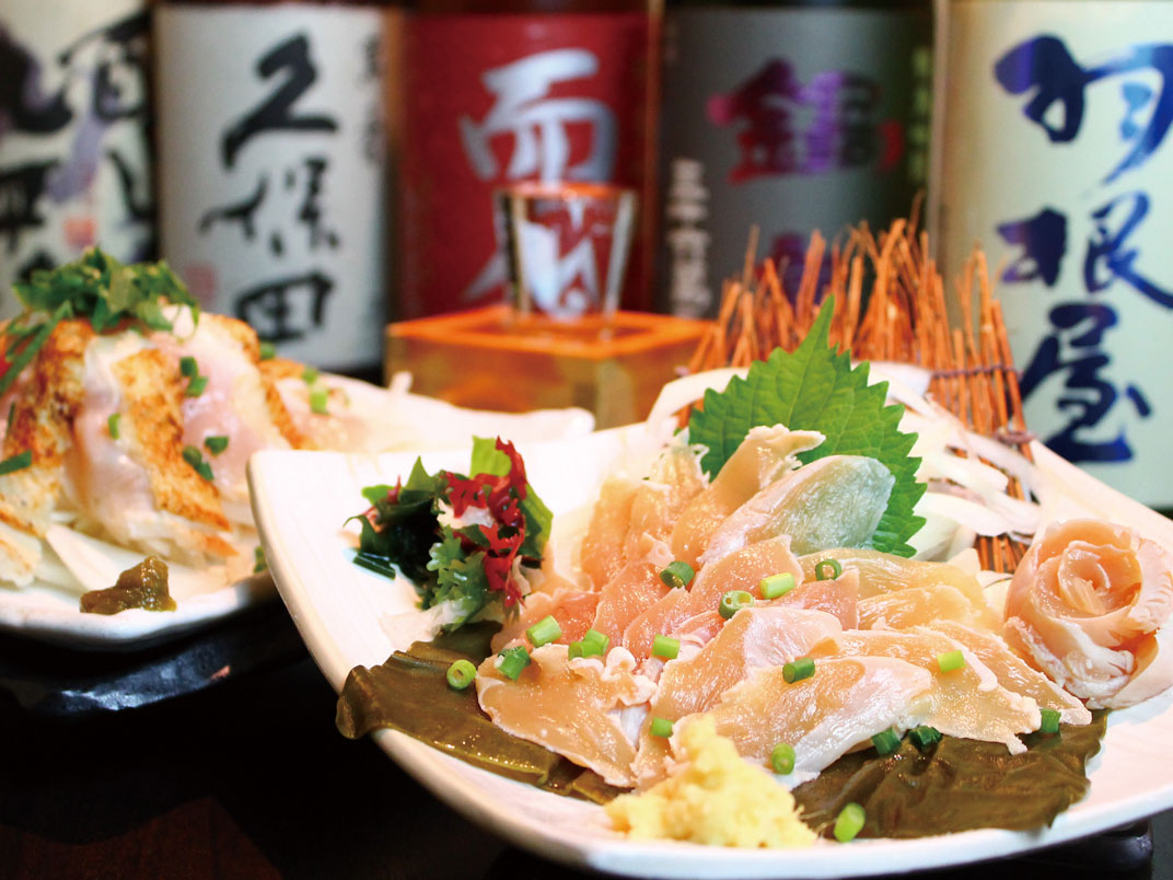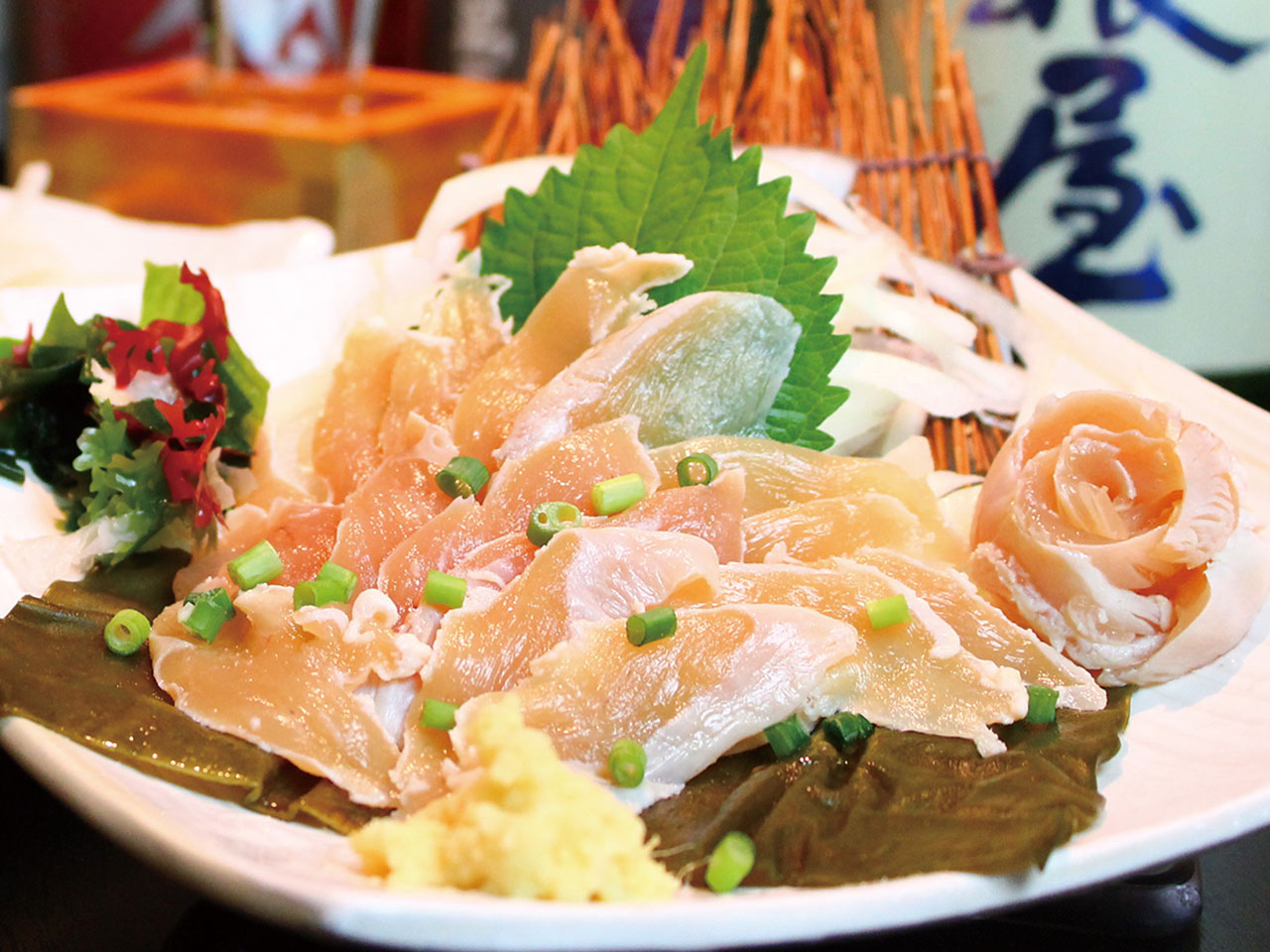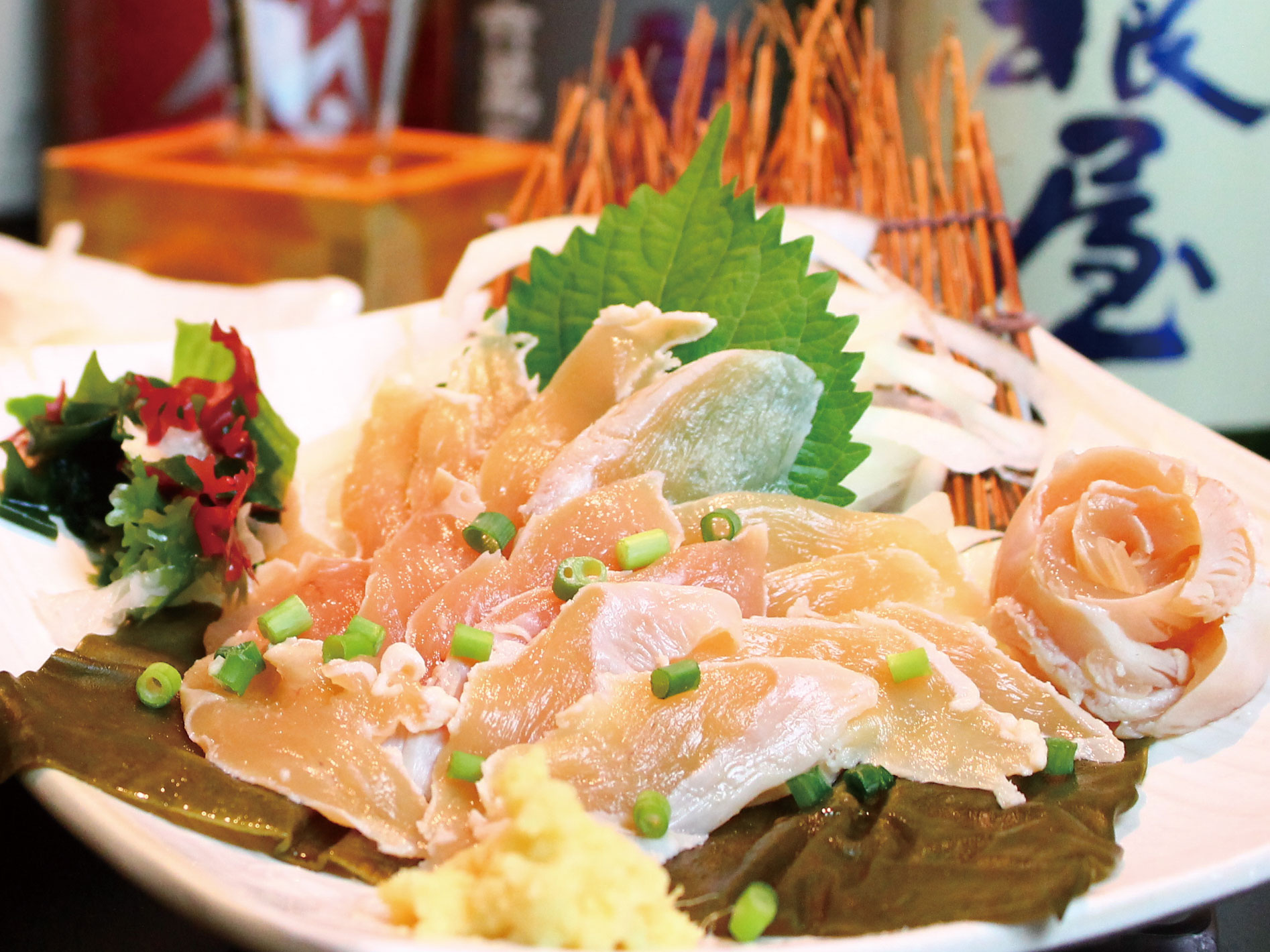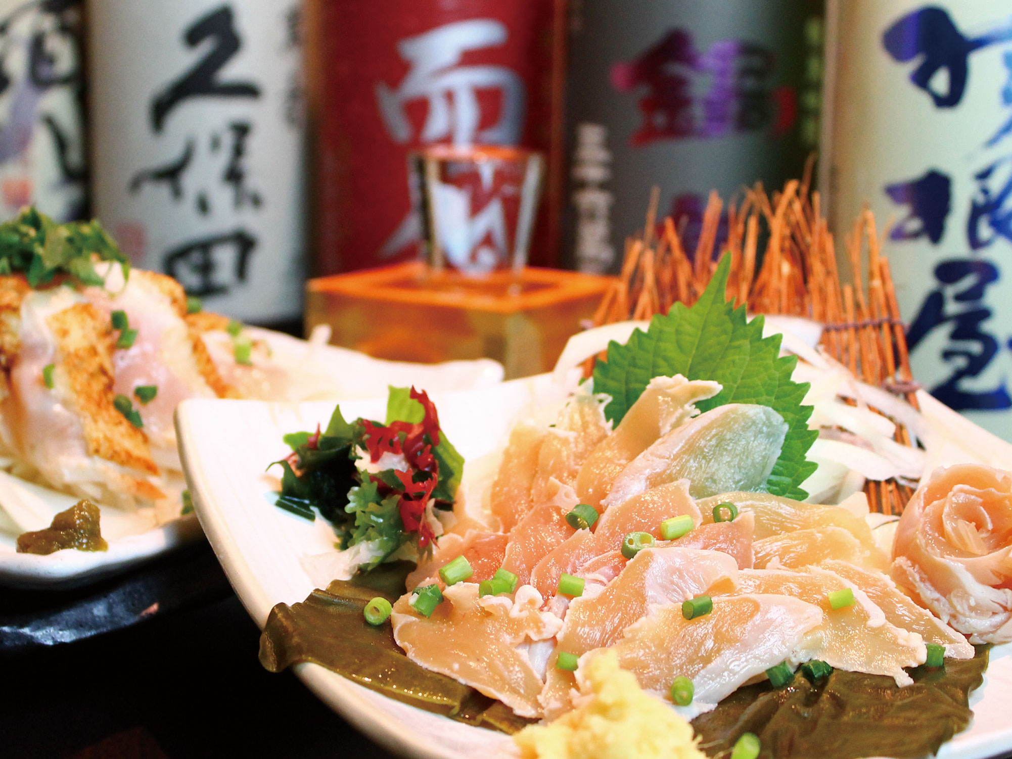 名古屋名物コーチン鶏を、焼き鳥や手羽先唐揚げなど多種多様な料理で楽しめる。おすすめは「コーチン鶏ささ身の昆布〆」!! 直送の新鮮な鶏だからこそ刺身で堪能。