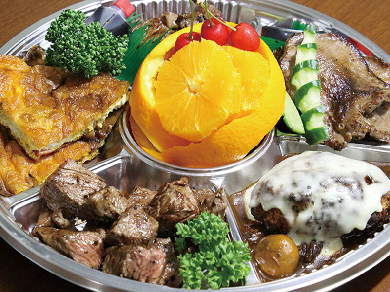 リッチに家飲みを楽しみたい人にはオードブル(2人前、5,000円〜)がオススメ! ステーキ弁当(1,400円)やデラックス弁当(2,800円)など、弁当も種類豊富にそろう。