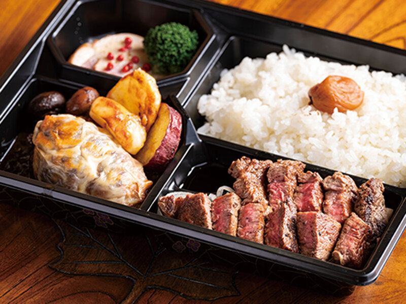 テイクアウトでも名店の味を楽しめる! 大人気の「おもてなしステーキ弁当(2,400円)」は家族や友人とのお出かけやピクニックにぴったり! 気軽に問合せを。
