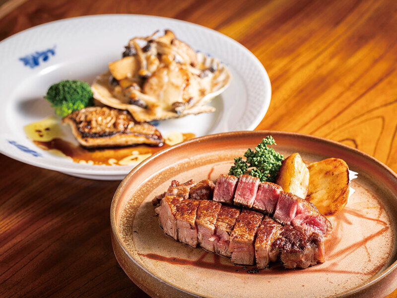 北海道産帆立のクリームグラタン、A5シャトーブリアンステーキ、生クリームを使ったきのこシチューライス、自家製ピスタチオのアイスと苺のデザート等。