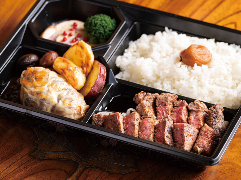 お出かけや家族の集まり、ビジネスシーンに。「おもてなし弁当」は、こだわりの肉を満喫できる大人気メニュー。注文は2個~。